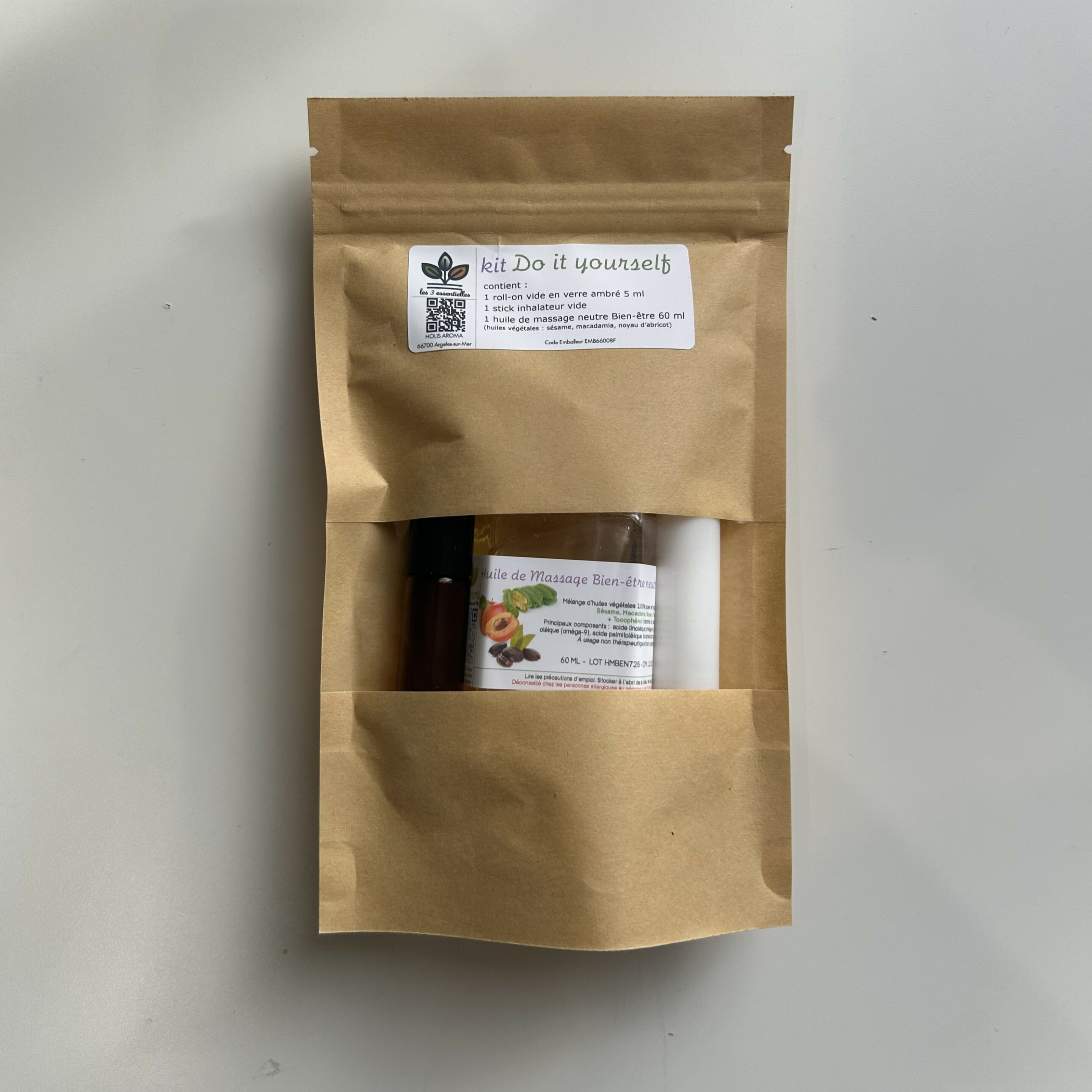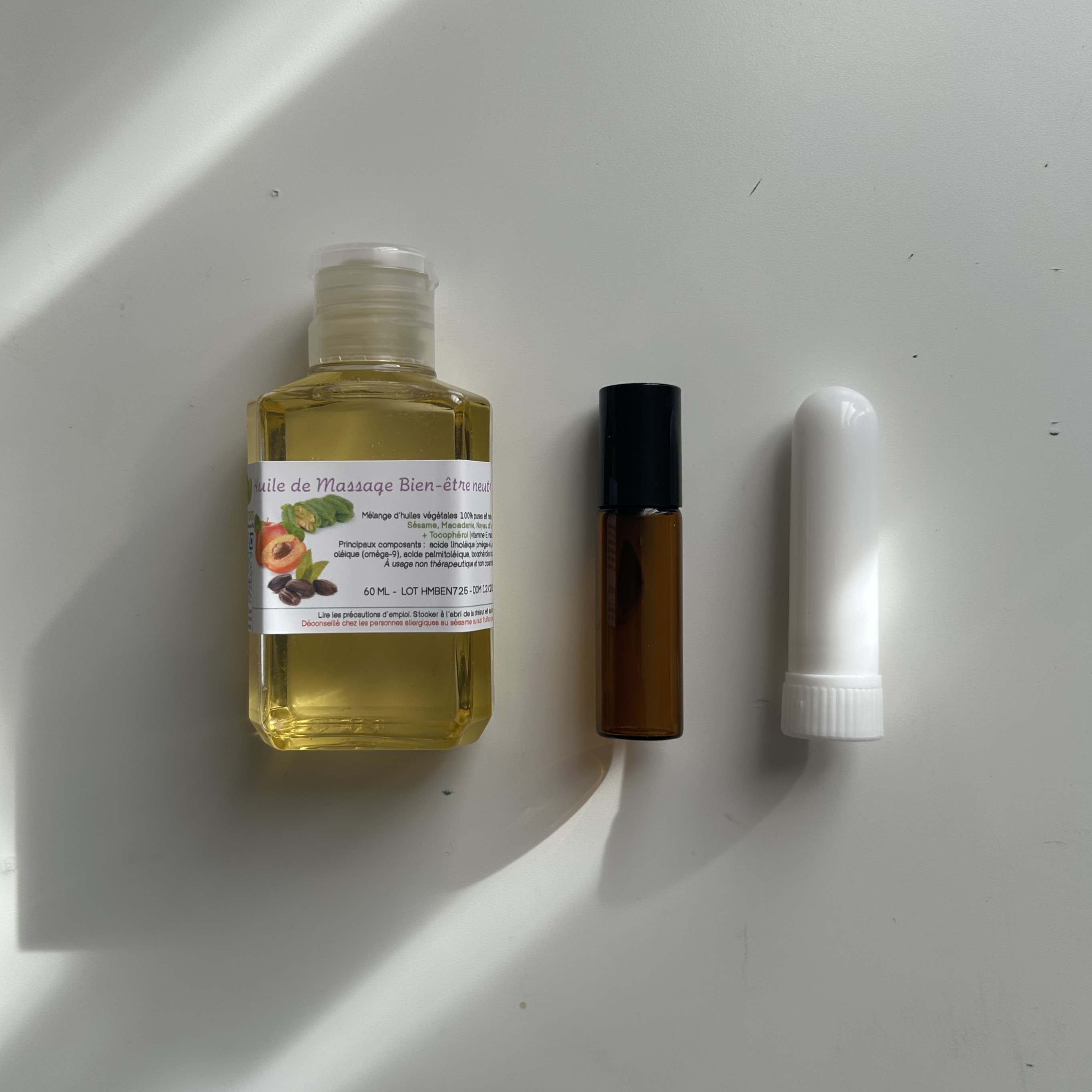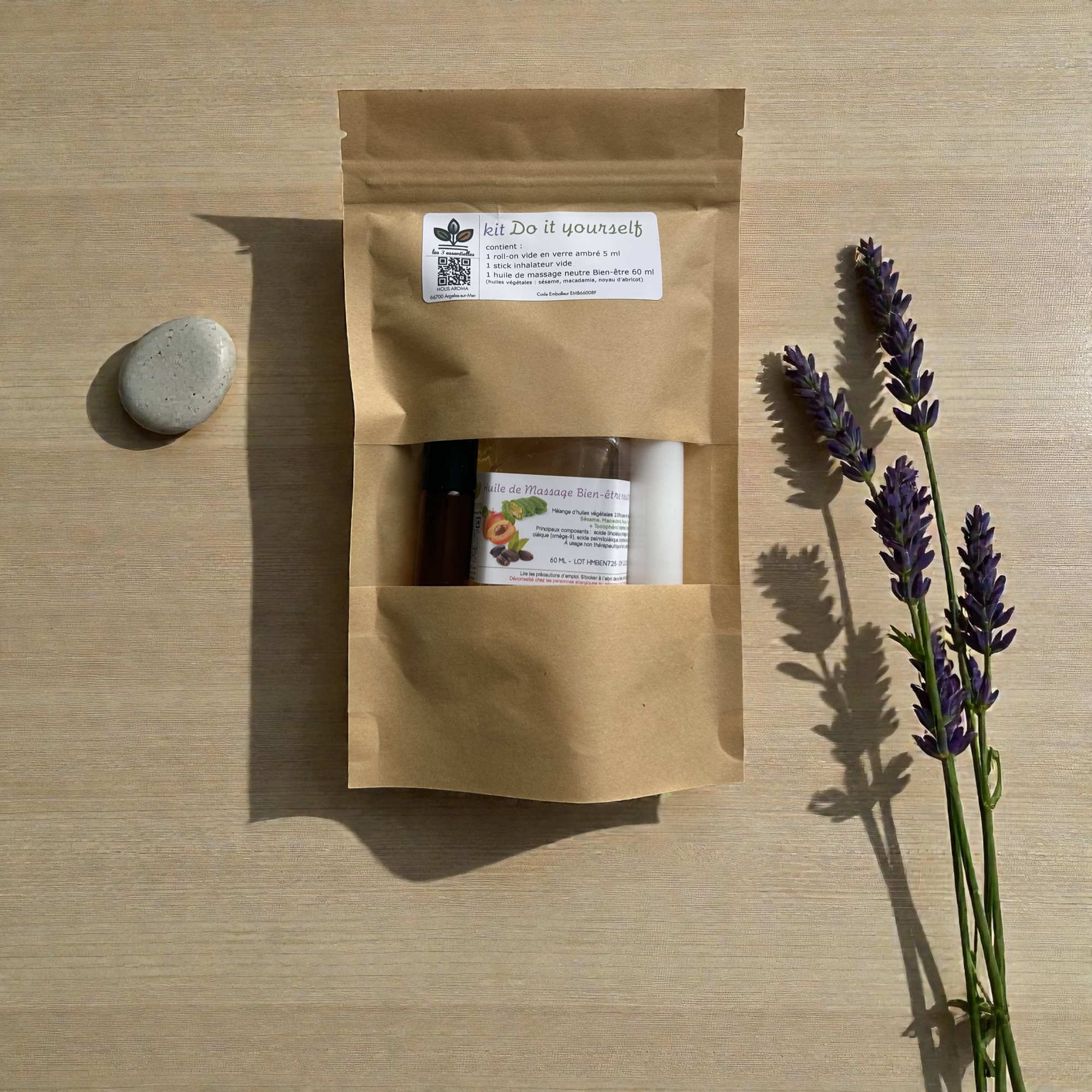 Ce kit contient les essentiels pour réaliser vos mélanges : un roll-on en verre ambré, un stick inhalateur, et une huile de massage bien-être neutre, parfaite comme base pour accueillir vos synergies d’huiles essentielles. Le verre ambré protège vos préparations de la lumière et assure une conservation optimale.